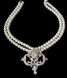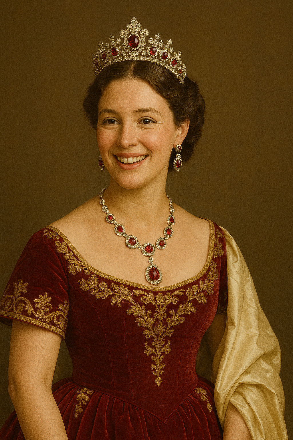 Around her neck drapes a breath-taking diamond necklace, composed of round brilliant and pear-cut stones in a symmetrical design that culminates in a striking teardrop pendant. Her matching diamond earrings mirror this shape, delicately framing her face and enhancing her graceful neckline.