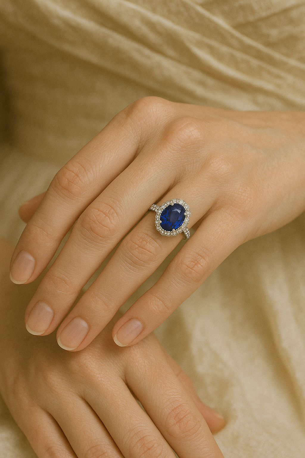 The ring she is wearing is a breathtaking masterpiece, centered around a vivid royal blue sapphire that commands attention with its rich depth and luminosity. Expertly faceted, the oval sapphire is surrounded by a delicate halo of brilliant-cut white diamonds, each meticulously set to amplify the central stone’s brilliance. The diamonds continue along the band, enhancing the overall sparkle and elegance of the ring.
