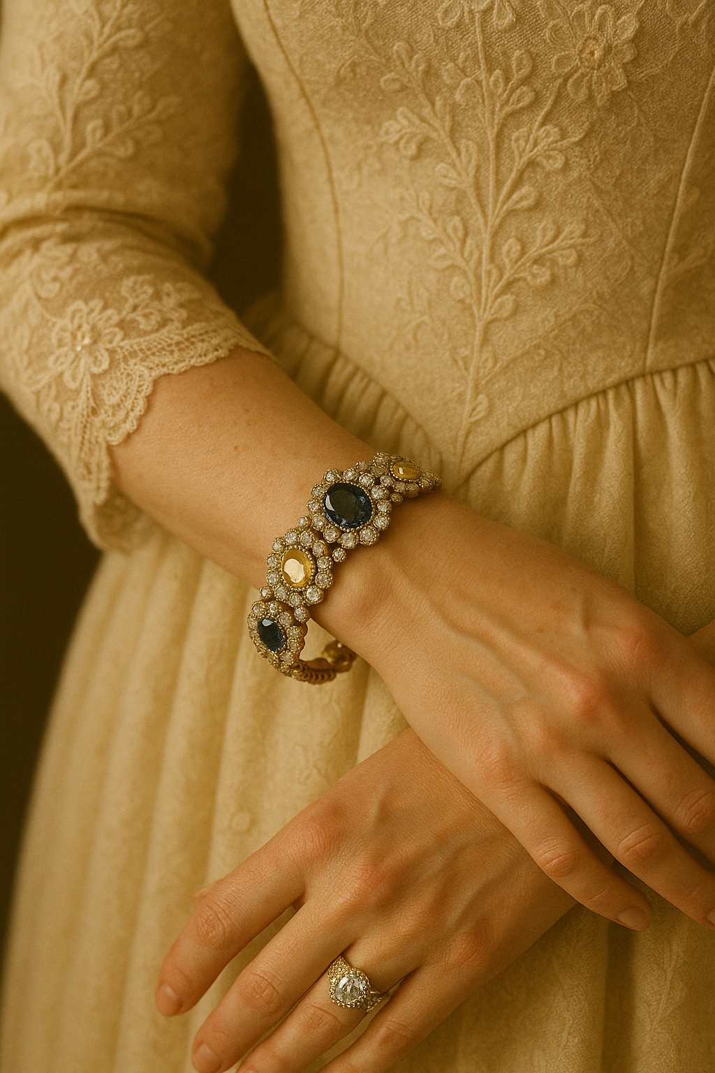 Each cluster is meticulously arranged to form a repeating floral motif, giving the bracelet both symmetry and a regal aesthetic. The diamonds extend slightly into the connecting links, creating a seamless sparkle around the wrist. This bracelet is not only a statement of colour and craftsmanship—it’s a timeless heirloom that bridges sophistication with storytelling.