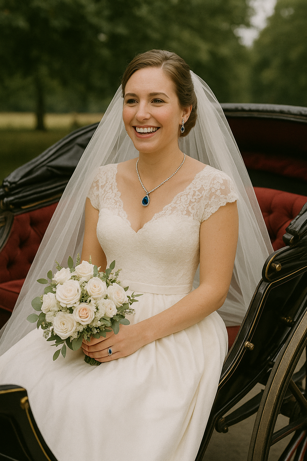The bride, radiant with joy, sits gracefully in a vintage black and burgundy horse-drawn carriage, embodying timeless elegance. Her ivory gown, adorned with delicate lace details at the shoulders, is perfectly complemented by a stunning set of sapphire and diamond jewelry. Around her neck lies a brilliant necklace, centered by a deep royal blue sapphire pendant framed in diamonds, drawing the eye with its regal charm.