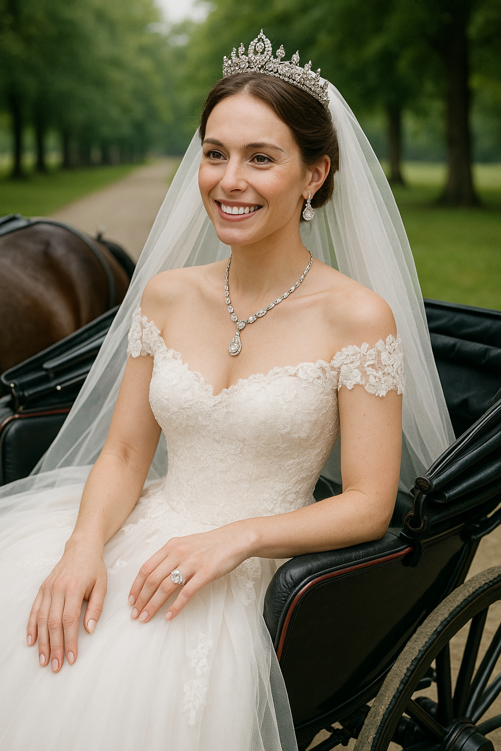 With soft curls swept into a classic updo and a bouquet of ivory roses in hand, she radiates sophistication as she embarks on her special day, carried by the elegance of the horse carriage and the brilliance of her jewels.