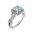 The centre stone is surrounded by a single micro-set halo with a subtle gap, creating depth while enhancing the brilliance of the main diamond. Flowing into the band, the double-row split shoulders are micro-set with diamonds totalling 0.50ct, forming an elegant cross-over infinity style that symbolises everlasting love.